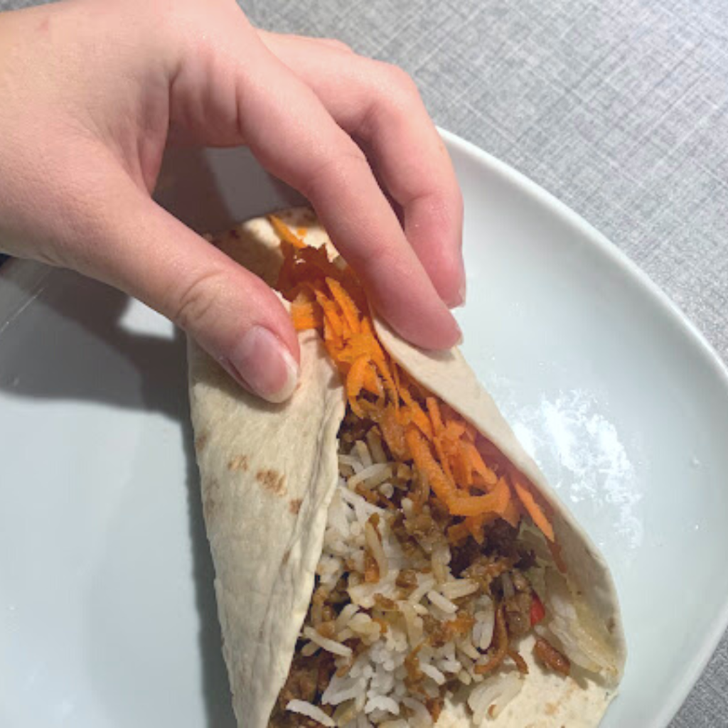 Här möts krämig vegofärs och ris i ett bröd. Råvarorna gör att det blir både billigt och god. Tips är att ha i mer grönsaker för att fylla burriton ytterligare.